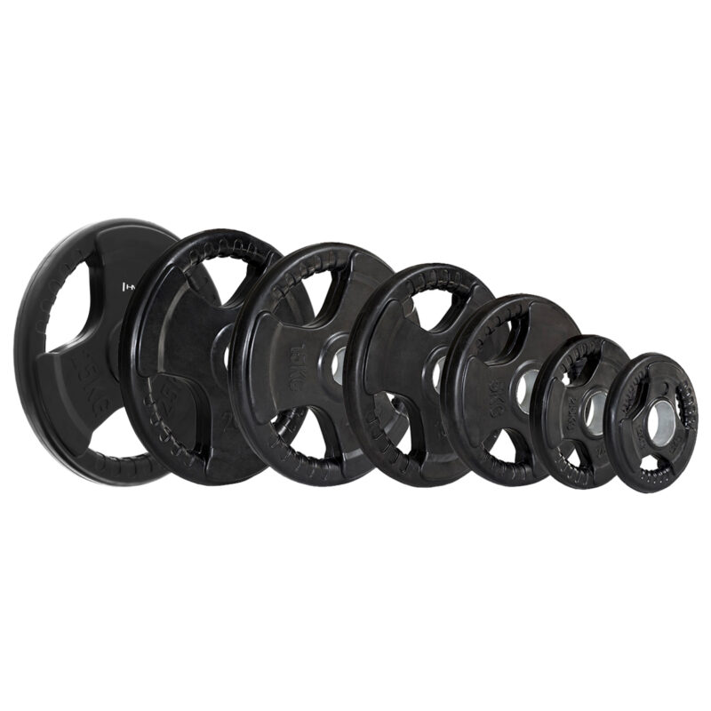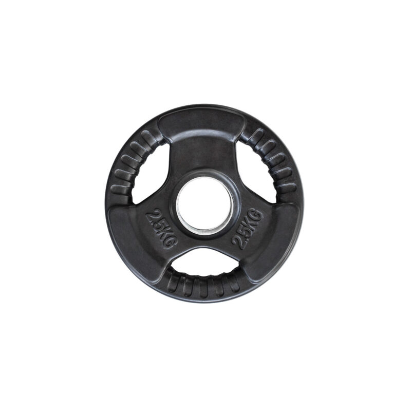 Die olympische Hantelscheibe wurde mit speziell profilierten Griffen ausgestattet. Dadurch können Sie schnell und sicher die Hantelscheiben z.B. auf Kurz- oder Langhantelstangen ändern.