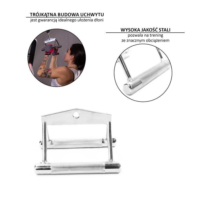 Der UW05 HMS Parallelgriff eignet sich für Trainings mit Lat- und Kabelzugstation. Er dient zu Übungen der Rückenmuskeln, aber er ist auch ideal bei Trainings mit einer halben Langhantel (Die zweite Hälfte stützt man auf den Boden). Die Hantelstange passt sich ideal in die Mitte dieses Parallelgriffs ein, was die Bewegungsfreiheit bei Rudern mit einer halben Langhantel gewährleistet.
