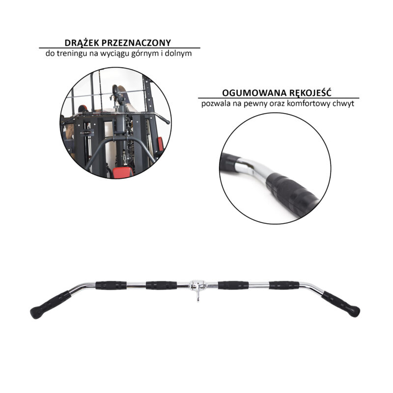 Die Latzugstange wurde aus hochwertigem Stahl hergestellt, was es Ihnen ermöglicht, die Übungen auch mit großer Belastung durchzuführen. Ihre Länge und Anzahl der Handgriffe aus Gummi gewährleisten viele Griffmöglichkeiten, von einem sehr engen bis einen sehr breiten Griff. Daher können Sie Ihre Muskeln auf verschiedenen Längen der Muskelansätze bei jeder Übung aufbauen.
