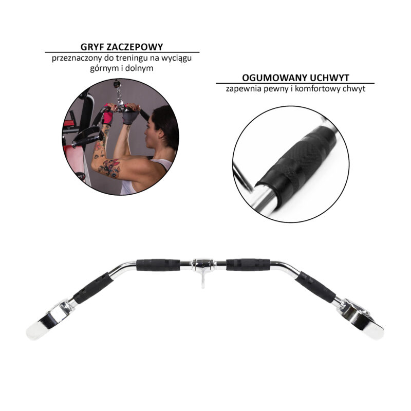 Die Latzugstange wurde aus hochwertigem Stahl hergestellt, was es Ihnen ermöglicht, die Übungen auch mit großem Gewicht durchzuführen. Ihre Länge und Abstand der Handgriffe aus Gummi gewährleisten viele Griffmöglichkeiten, von einem sehr engen bis einen sehr breiten Griff. Daher können Sie Ihre Muskeln auf verschiedenen Längen der Muskelansätze bei jeder Übung aufbauen. In breitesten Teilen der Latzugstange sind die Handgriffe in einem Winkel gestellt, der beim Ziehen der Stange am Latzugturm dazu beiträgt, dass man die Ellenbogen an den Oberkörper zieht, also bessere Übungstechnik wird beibehalten. Die Latzugstange ermöglicht es Ihnen, alternative Muskelansätze während der Trainings zu beanspruchen – im Vergleich mit einem einfachen Griff. Dafür sorgen die Endhandgriffe, die im neutralen Griff gestellt sind. Zusätzlich sind die Handgriffe aus Gummi, was den sicheren und komfortablen Griff gewährleistet. Sie müssen sich keine Sorge machen, dass diese Latzugstange aus Ihren Händen rutscht.